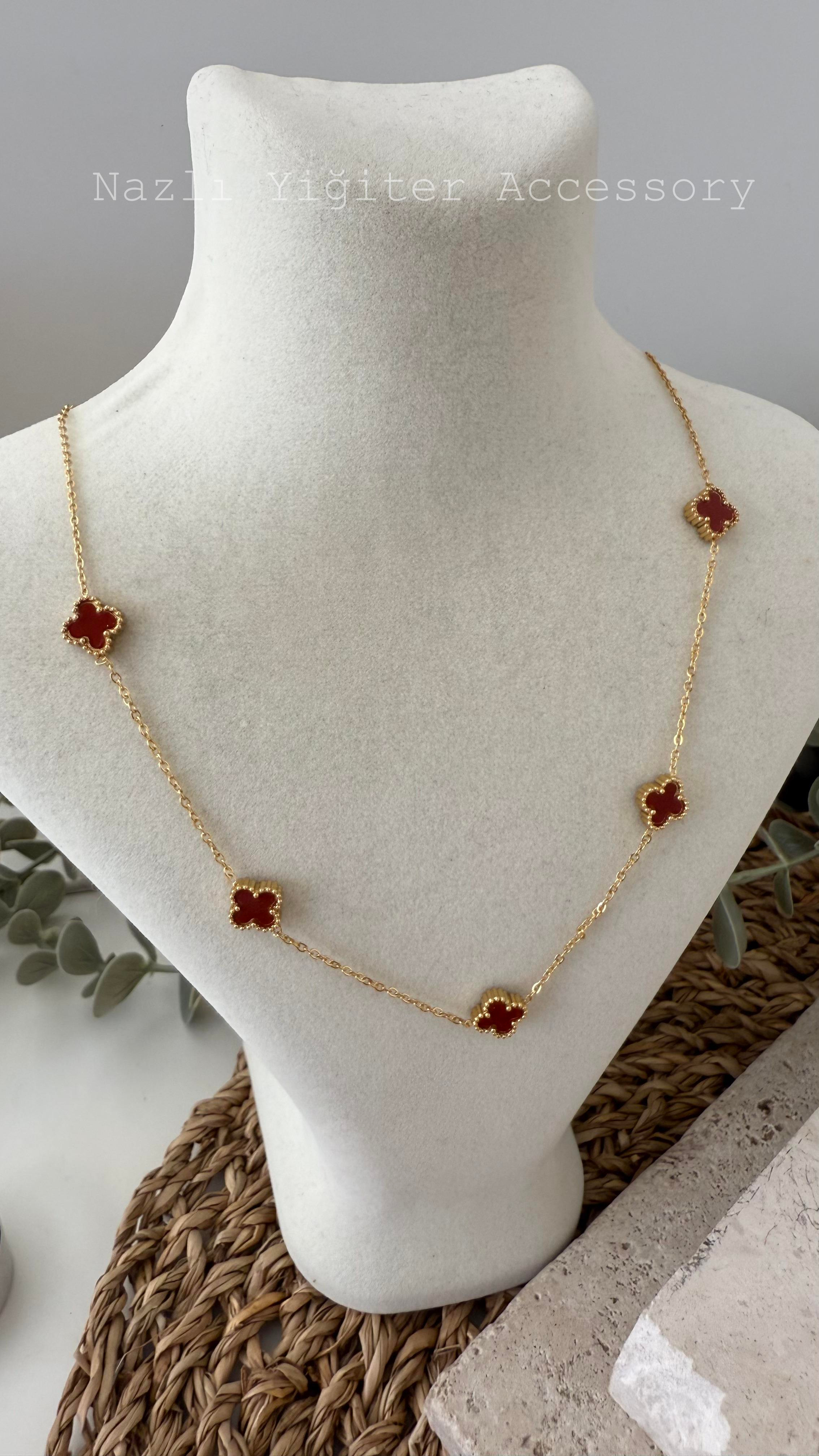 Çelik Gold Renk Yonca Mini Bordo Kolye