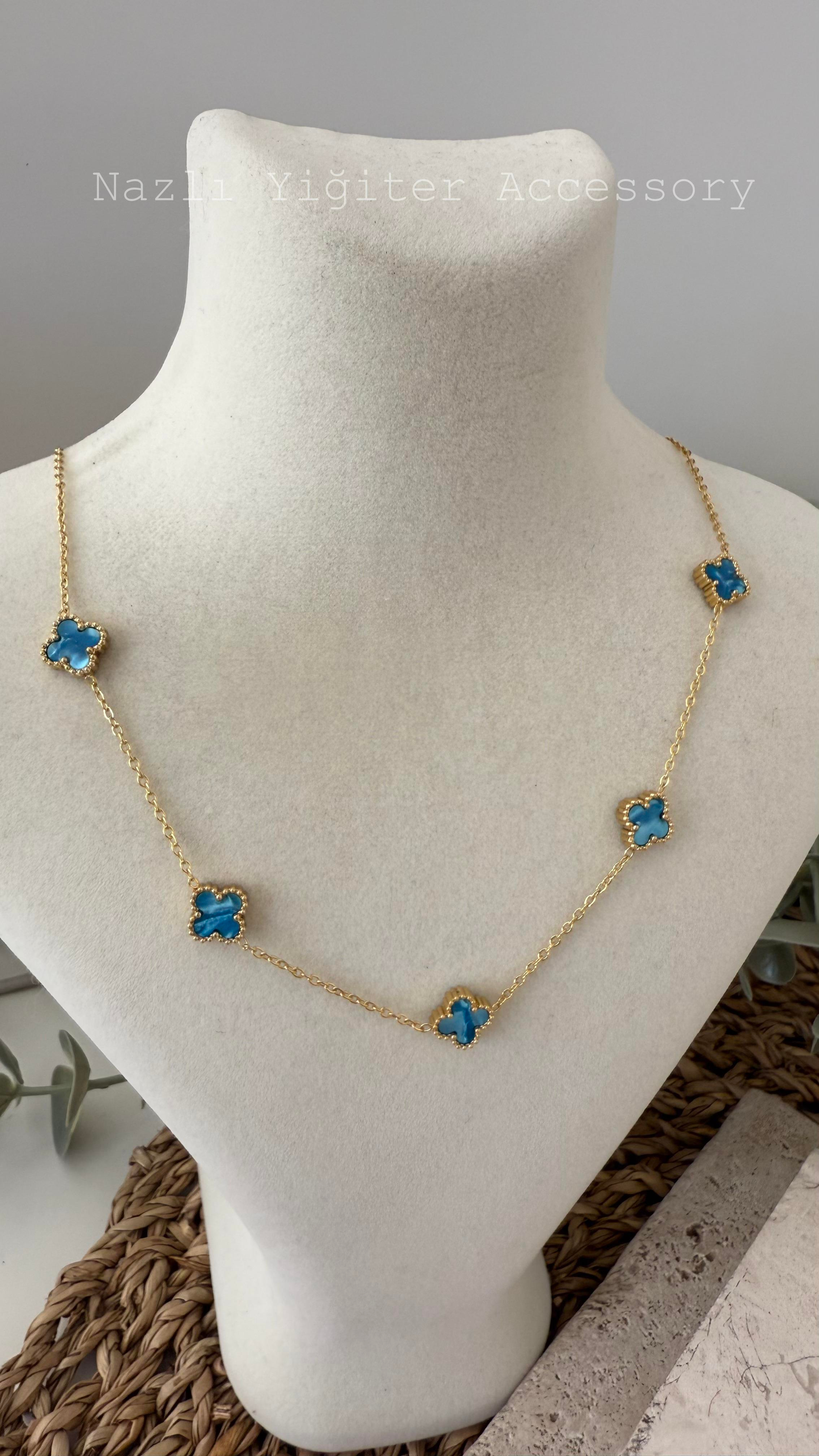 Çelik Gold Renk Yonca Mini Mavi Kolye