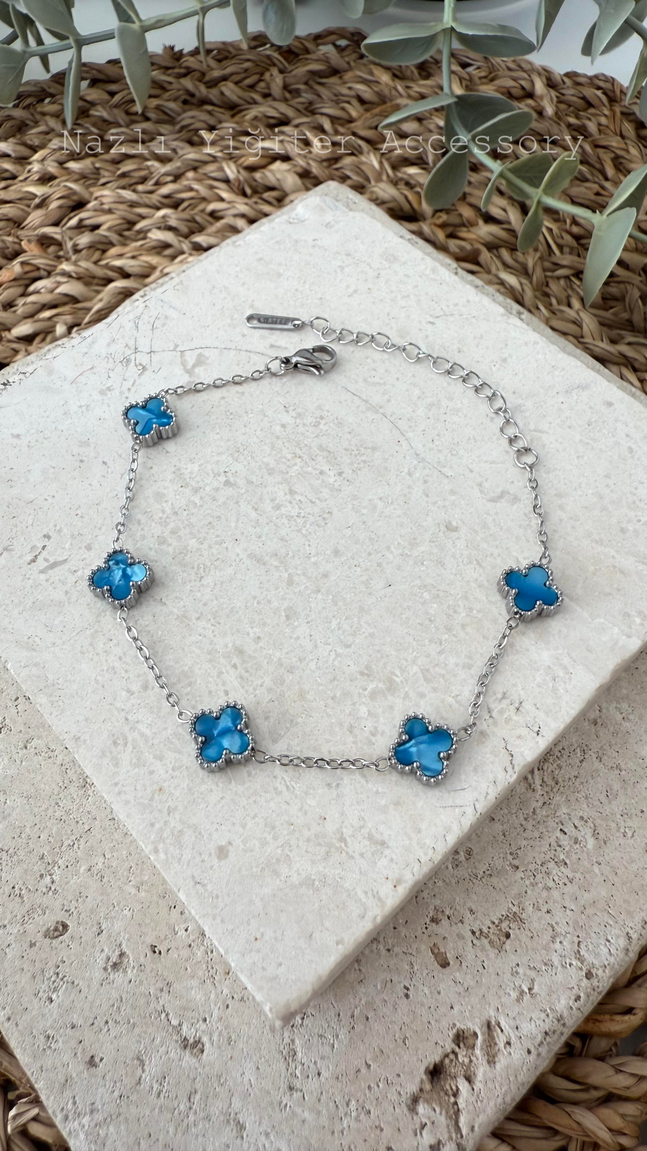 Çelik Gümüş Renk Mini Yonca Mavi Bileklik