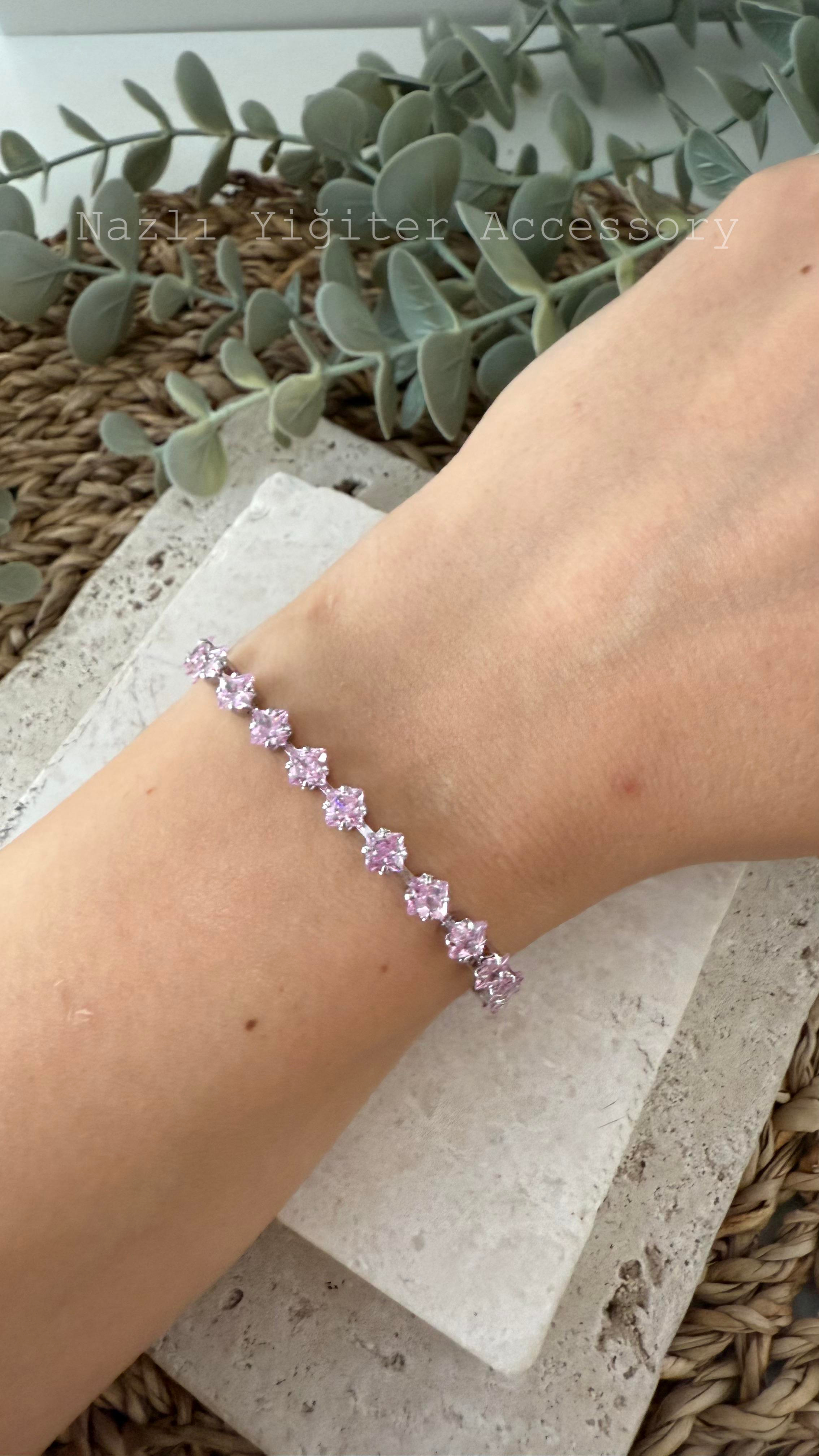 Çelik Gümüş Renk Pembe Taşlı Su Yolu Bileklik