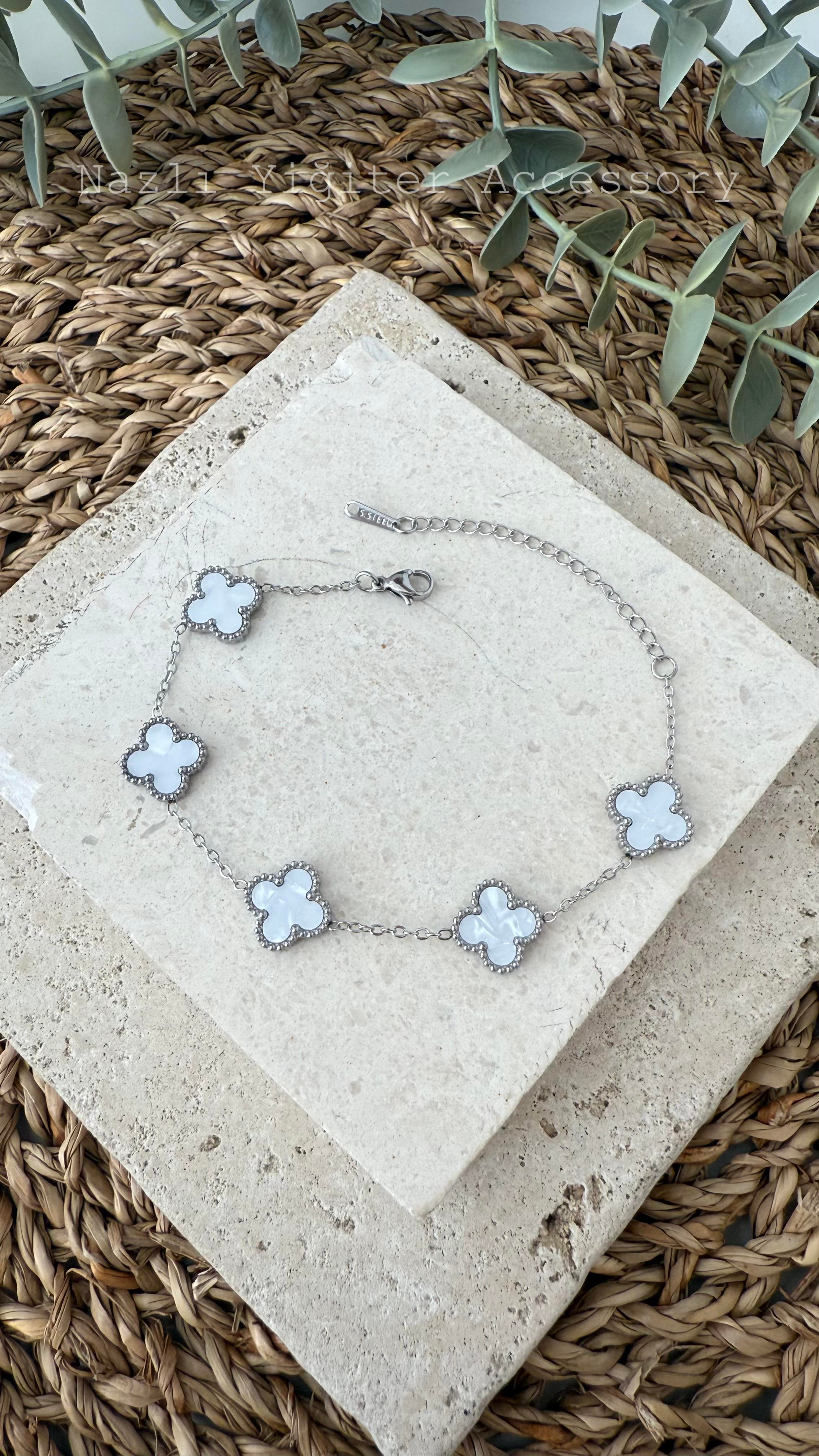 Çelik Gümüş Renk Yonca Beyaz Bileklik