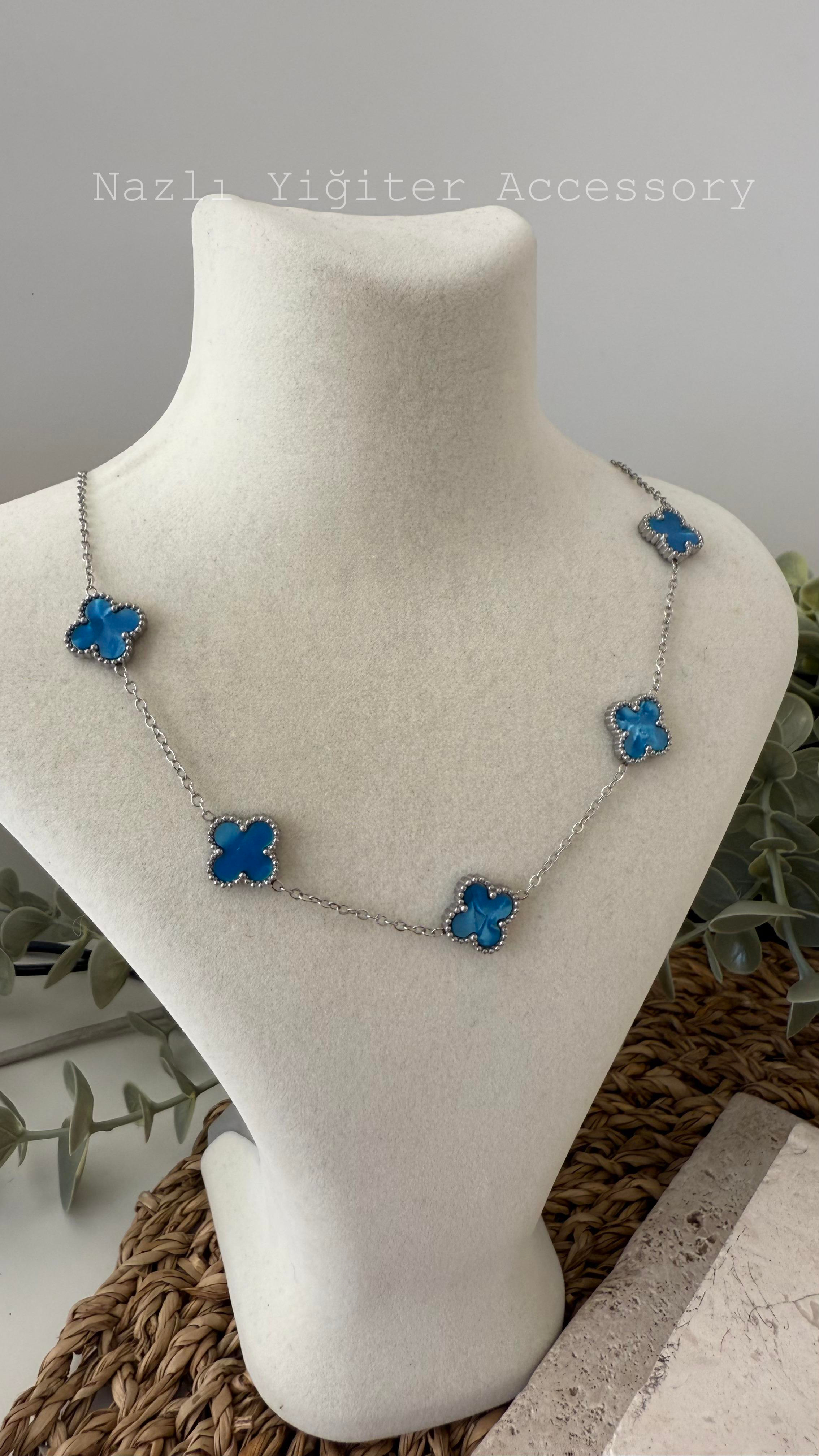 Çelik Gümüş Renk Yonca Mavi Kolye